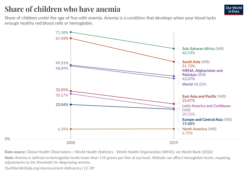 Reductions among children have been slightly more promising: the share of under-fives that are anemic dropped from 48% to 39% between 2000 and 2019.