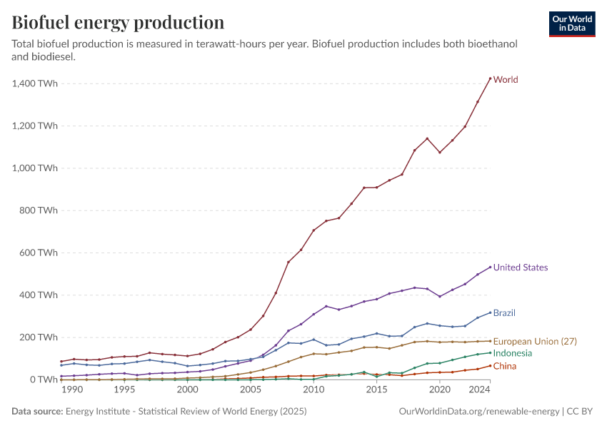 Hannah Ritchie and Pablo Rosado (2026) - “Putting solar panels on land used for biofuels would produce enough electricity for all cars and trucks to go electric” Published online at OurWorldinData.org. Retrieved from: 'https://style-housekeeper-simplifyre.owid.pages.dev:8789/20260123-150202/biofuel-land-solar-electric-vehicles.html' [Online Resource] (archived on January 23, 2026).BibTeX citation