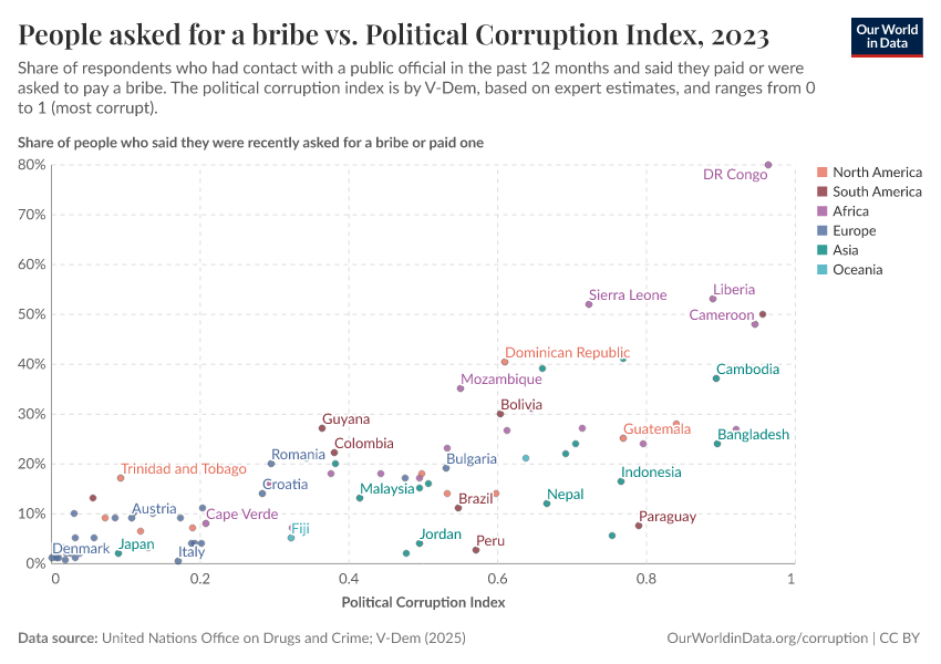 In our related article, you can read more about how corruption relates to broader development outcomes. While it does not cover the most recent research on the topic, it highlights key patterns and historical examples that remain relevant: