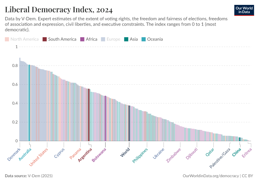Bastian Herre (2022) - “People around the world have gained democratic rights, but some have many more rights than others” Published online at OurWorldinData.org. Retrieved from: 'https://style-housekeeper-simplifyre.owid.pages.dev:8789/20260223-071105/democratic-world.html' [Online Resource] (archived on February 23, 2026).BibTeX citation