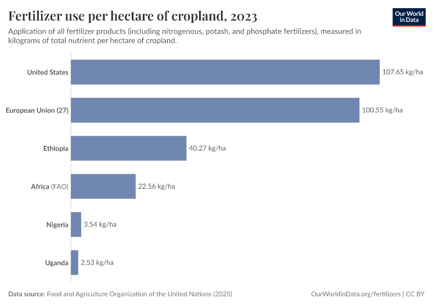 The European Union and the United States use about five times as much fertilizer per hectare as the African average. Within Africa, many countries use much less than this — as little as a few kilograms per hectare. Some lower-income countries use almost no fertilizers or pesticides and have little to regulate. This is shown in the chart below.