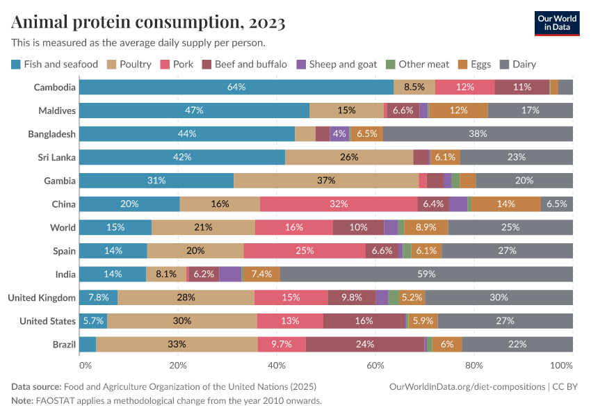 In some countries, seafood dominates. It accounts for the majority of animal protein in Cambodia, Bangladesh, and the Maldives.