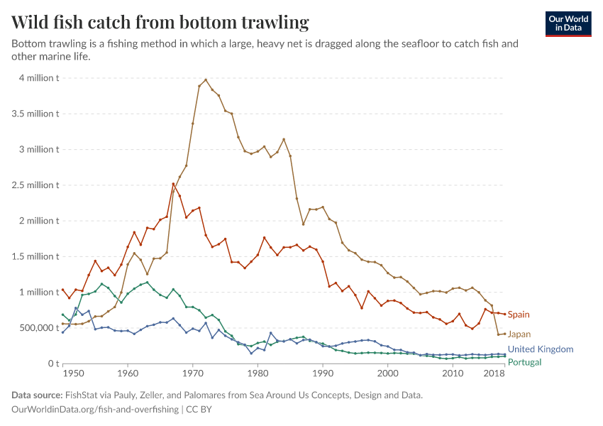 In contrast, bottom trawling is becoming less common across Europe. In many countries – such as the UK, Spain, and Portugal – bottom trawling was intense throughout the 1950s, 60s, and 70s but has since declined significantly. That has been partly driven by efforts to reduce overfishing and allow fish stocks to rebuild. In addition, the European Commission banned bottom trawling in deep waters – those below 800m in depth – in 2016.