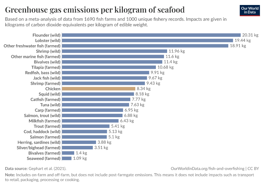 Our comparison of greenhouse gas emissions includes both wild-caught seafood and seafood from fish farms. Land use, nitrogen and phosphorus emissions, and freshwater use are only shown for farmed seafood – wild-caught fish do not really create these environmental impacts. Farmed fish do require land and can produce nutrient pollution from the production of feed to grow them.