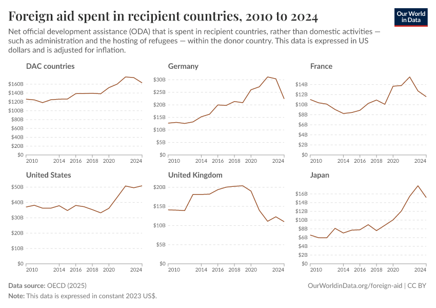 Simon van Teutem, Hannah Ritchie, and Pablo Arriagada (2025) - “How much foreign aid is spent domestically rather than overseas?” Published online at OurWorldinData.org. Retrieved from: 'https://style-housekeeper-simplifyre.owid.pages.dev:8789/20260223-070107/foreign-aid-domestic-overseas.html' [Online Resource] (archived on February 23, 2026).BibTeX citation
