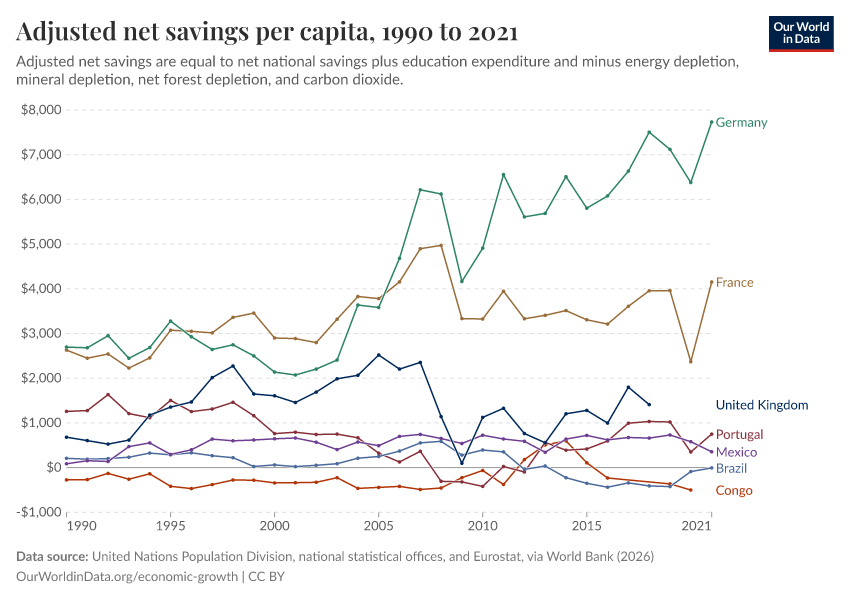 “Data Page: Adjusted net savings per capita”. Our World in Data (2026). Data adapted from United Nations Population Division, national statistical offices, and Eurostat, via World Bank. Retrieved from https://style-housekeeper-simplifyre.owid.pages.dev:8789/20260202-181317/grapher/adjusted-net-savings-per-person.html [online resource] (archived on February 2, 2026).How to cite this data