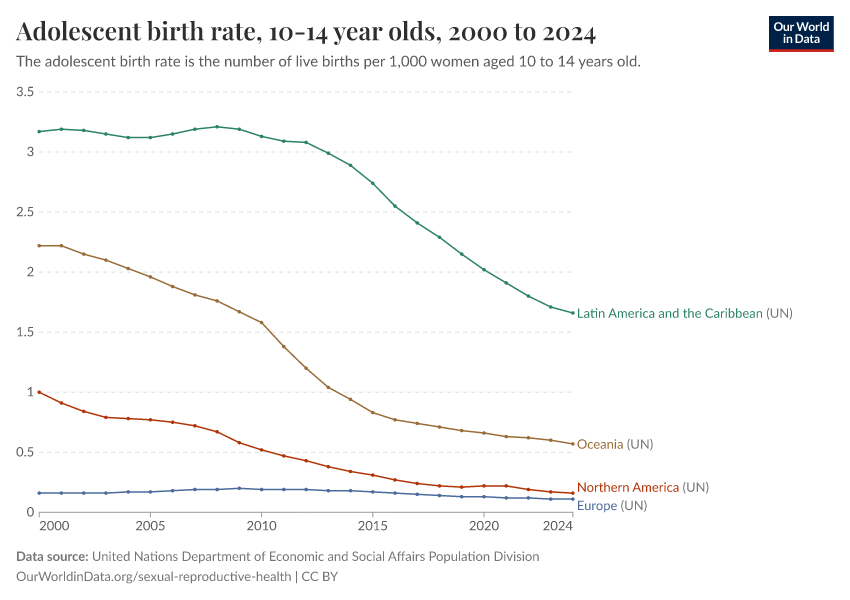 “Data Page: Adolescent birth rate, 10-14 year olds”. Our World in Data (2026). Data adapted from United Nations Department of Economic and Social Affairs Population Division. Retrieved from https://style-housekeeper-simplifyre.owid.pages.dev:8789/20260130-180113/grapher/adolescent-fertility.html [online resource] (archived on January 30, 2026).How to cite this data