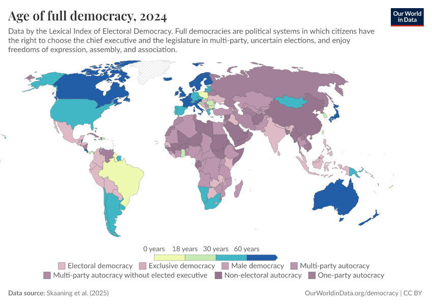 Skaaning et al. (2025) – processed by Our World in Data. “Age of full democracy” [dataset]. Skaaning et al., “Lexical Index of Electoral Democracy (LIED) v6.8” [original data]. Retrieved February 25, 2026 from https://style-housekeeper-simplifyre.owid.pages.dev:8789/20260119-065148/grapher/age-of-full-democracy.html (archived on January 19, 2026).