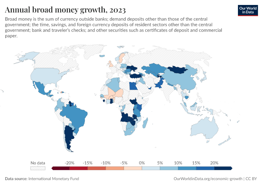 International Monetary Fund – processed by Our World in Data. “Annual broad money growth” [dataset]. International Monetary Fund, “International Monetary Fund, International Financial Statistics and data files.” [original data]. Retrieved February 25, 2026 from https://style-housekeeper-simplifyre.owid.pages.dev:8789/20251120-211749/grapher/annual-broad-money-growth.html (archived on November 20, 2025).
