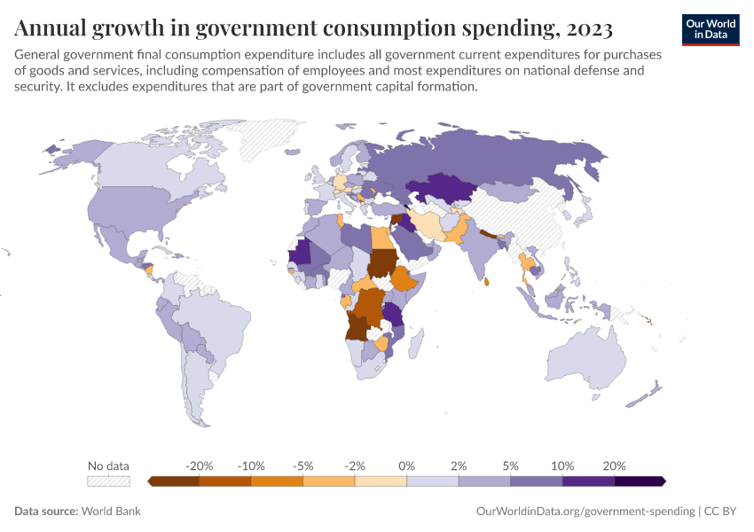 “Data Page: Annual growth in government consumption spending”. Our World in Data (2026). Data adapted from World Bank. Retrieved from https://style-housekeeper-simplifyre.owid.pages.dev:8789/20260130-180113/grapher/annual-growth-of-general-government-final-consumption-expenditure.html [online resource] (archived on January 30, 2026).How to cite this data