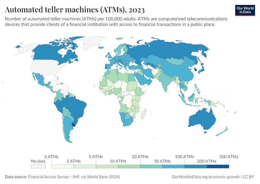 “Data Page: Automated teller machines (ATMs)”. Our World in Data (2026). Data adapted from Financial Access Survey - IMF, via World Bank. Retrieved from https://style-housekeeper-simplifyre.owid.pages.dev:8789/20260202-181317/grapher/automated-teller-machines-atms-per-100000-adults.html [online resource] (archived on February 2, 2026).How to cite this data