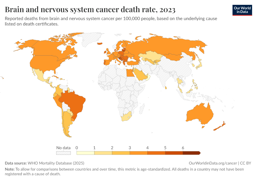 WHO Mortality Database (2025) – with minor processing by Our World in Data. “Brain and nervous system cancer death rate” [dataset]. WHO Mortality Database, “WHO Mortality Database” [original data]. Retrieved February 25, 2026 from https://style-housekeeper-simplifyre.owid.pages.dev:8789/20250909-093708/grapher/brain-and-nervous-system-cancer-death-rate.html (archived on September 9, 2025).