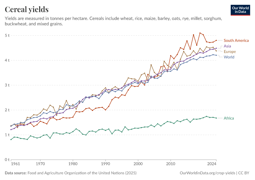 “Data Page: Cereal yields”, part of the following publication: Hannah Ritchie, Pablo Rosado, and Max Roser (2023) - “Agricultural Production”. Data adapted from Food and Agriculture Organization of the United Nations. Retrieved from https://style-housekeeper-simplifyre.owid.pages.dev:8789/20260116-143329/grapher/cereal-yield.html [online resource] (archived on January 16, 2026).