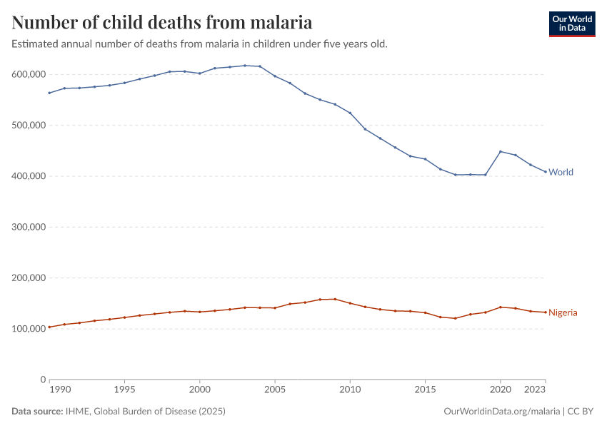 IHME, Global Burden of Disease (2025) – with major processing by Our World in Data. “Number of child deaths from malaria” [dataset]. IHME, Global Burden of Disease, “Global Burden of Disease - Deaths” [original data]. Retrieved February 25, 2026 from https://style-housekeeper-simplifyre.owid.pages.dev:8789/20260211-174736/grapher/child-deaths-from-malaria-number.html (archived on February 11, 2026).
