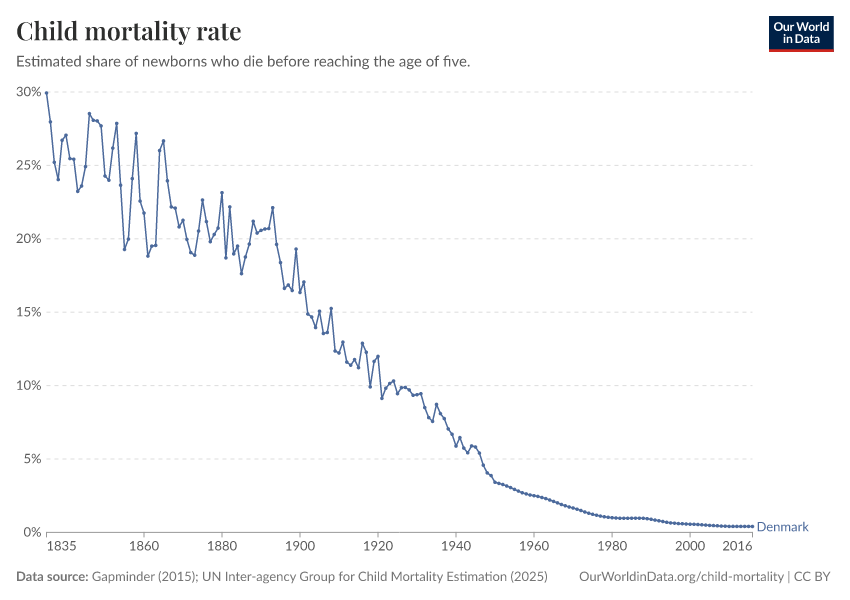 Gapminder (2015); UN Inter-agency Group for Child Mortality Estimation (2025) – processed by Our World in Data. “Child mortality rate – Gapminder; UN IGME – Long-run data” [dataset]. United Nations Inter-agency Group for Child Mortality Estimation, “United Nations Inter-agency Group for Child Mortality Estimation”; Gapminder, “Child mortality rate under age five v7”; Gapminder based on UN IGME & UN WPP, “Under-five Mortality v11”; Various sources, “Population” [original data]. Retrieved February 25, 2026 from https://style-housekeeper-simplifyre.owid.pages.dev:8789/20260119-070102/grapher/child-mortality.html (archived on January 19, 2026).
