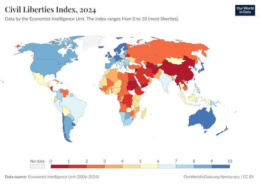Economist Intelligence Unit (2006-2024) – processed by Our World in Data. “Civil Liberties Index” [dataset]. Economist Intelligence Unit, “Democracy Index 2021: The China challenge”; Economist Intelligence Unit, “Democracy Index 2022: Frontline democracy and the battle for Ukraine”; Economist Intelligence Unit, “Democracy Index 2023: Age of Conflict”; Economist Intelligence Unit, “Democracy Index 2024: What's wrong with representative democracy?”; Gapminder, “Democracy Index v4”; Various sources, “Population” [original data]. Retrieved February 25, 2026 from https://style-housekeeper-simplifyre.owid.pages.dev:8789/20260119-070102/grapher/civil-liberties-index-eiu.html (archived on January 19, 2026).