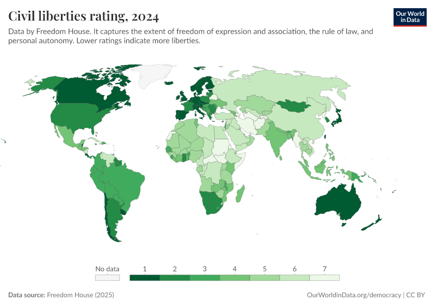 Freedom House (2025) – processed by Our World in Data. “Civil liberties rating” [dataset]. Freedom House, “Freedom in the World” [original data]. Retrieved February 25, 2026 from https://style-housekeeper-simplifyre.owid.pages.dev:8789/20260119-070102/grapher/civil-liberties-rating-fh.html (archived on January 19, 2026).