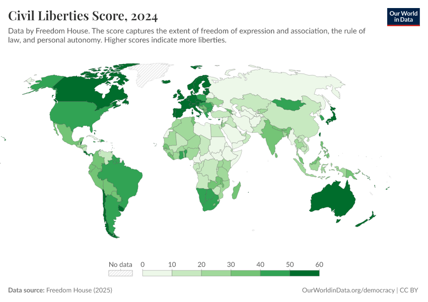 Freedom House (2025) – processed by Our World in Data. “Civil Liberties Score” [dataset]. Freedom House, “Freedom in the World” [original data]. Retrieved February 25, 2026 from https://style-housekeeper-simplifyre.owid.pages.dev:8789/20260204-170225/grapher/civil-liberties-score-fh.html (archived on February 4, 2026).