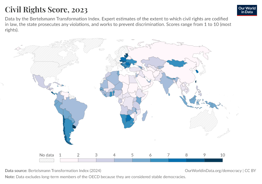 Bertelsmann Transformation Index (2024) – processed by Our World in Data. “Civil Rights Score” [dataset]. Bertelsmann Transformation Index, “Bertelsmann Transformation Index, Scores” [original data]. Retrieved February 25, 2026 from https://style-housekeeper-simplifyre.owid.pages.dev:8789/20260204-165456/grapher/civil-rights-score-bti.html (archived on February 4, 2026).