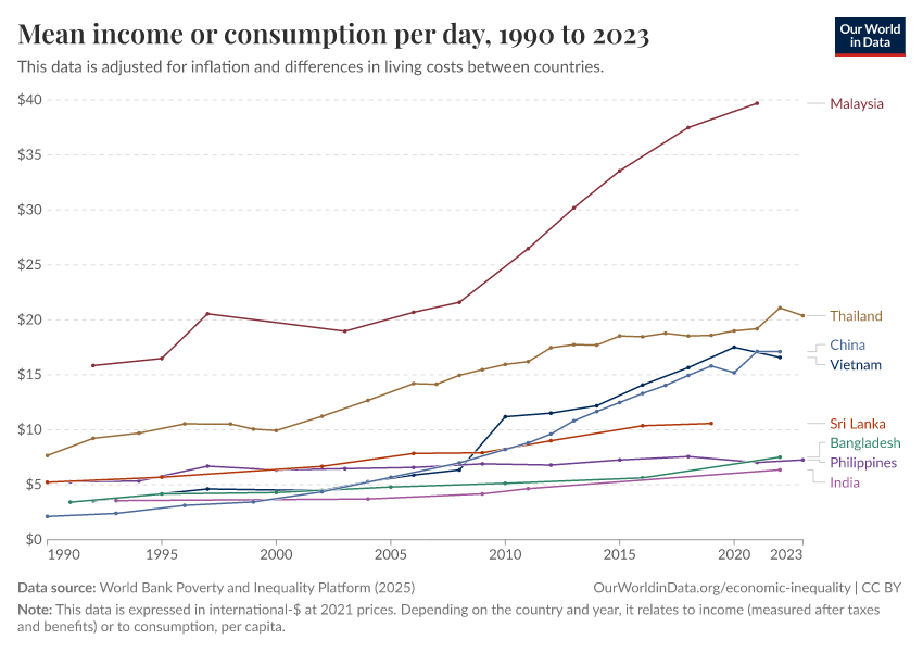 World Bank Poverty and Inequality Platform (2025) – with major processing by Our World in Data. “Mean income or consumption per day – World Bank” [dataset]. World Bank Poverty and Inequality Platform, “World Bank Poverty and Inequality Platform (PIP) 20250930_2021, 20250930_2017” [original data]. Retrieved February 25, 2026 from https://style-housekeeper-simplifyre.owid.pages.dev:8789/20260127-114142/grapher/daily-mean-income.html (archived on January 27, 2026).
