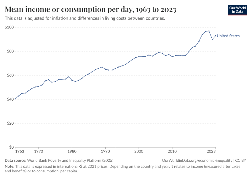 World Bank Poverty and Inequality Platform (2025) – with major processing by Our World in Data. “Mean income or consumption per day – World Bank” [dataset]. World Bank Poverty and Inequality Platform, “World Bank Poverty and Inequality Platform (PIP) 20250930_2021, 20250930_2017” [original data]. Retrieved February 25, 2026 from https://style-housekeeper-simplifyre.owid.pages.dev:8789/20260127-114142/grapher/daily-mean-income.html (archived on January 27, 2026).