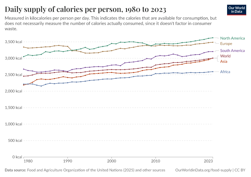 “Data Page: Daily supply of calories per person”, part of the following publication: Max Roser, Hannah Ritchie, and Pablo Rosado (2013) - “Food Supply”. Data adapted from Food and Agriculture Organization of the United Nations, Harris et al., Floud et al., Jonsson, Grigg, Fogel, USDA Economic Research Service (ERS). Retrieved from https://style-housekeeper-simplifyre.owid.pages.dev:8789/20260116-144923/grapher/daily-per-capita-caloric-supply.html [online resource] (archived on January 16, 2026).How to cite this data