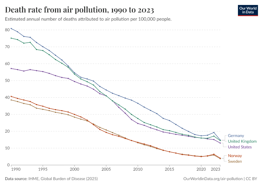 “Data Page: Death rate from air pollution”, part of the following publication: Esteban Ortiz-Ospina and Max Roser (2016) - “Global Health”. Data adapted from IHME, Global Burden of Disease. Retrieved from https://style-housekeeper-simplifyre.owid.pages.dev:8789/20260213-112438/grapher/death-rate-from-air-pollution-per-100000.html [online resource] (archived on February 13, 2026).How to cite this data