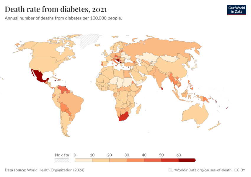 World Health Organization (2024) – with major processing by Our World in Data. “Death rate from diabetes” [dataset]. World Health Organization, “Global Health Estimates” [original data]. Retrieved February 25, 2026 from https://style-housekeeper-simplifyre.owid.pages.dev:8789/20250909-093708/grapher/death-rate-from-diabetes-ghe.html (archived on September 9, 2025).