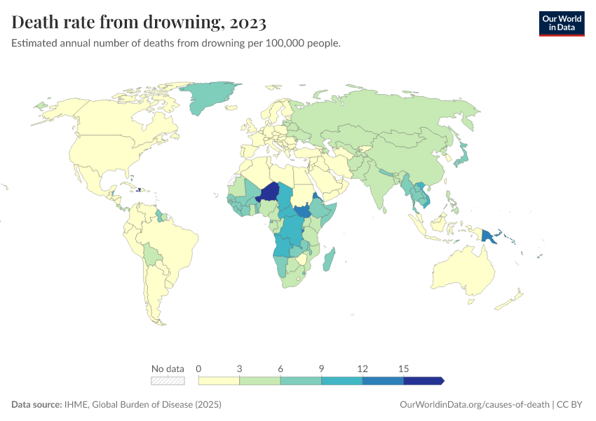 IHME, Global Burden of Disease (2025) – with major processing by Our World in Data. “Death rate from drowning” [dataset]. IHME, Global Burden of Disease, “Global Burden of Disease - Deaths” [original data]. Retrieved February 25, 2026 from https://style-housekeeper-simplifyre.owid.pages.dev:8789/20260211-174736/grapher/death-rate-from-drowning.html (archived on February 11, 2026).