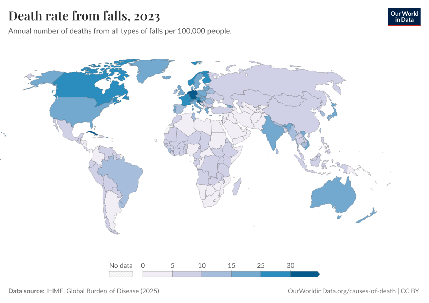 IHME, Global Burden of Disease (2025) – with major processing by Our World in Data. “Death rate from falls” [dataset]. IHME, Global Burden of Disease, “Global Burden of Disease - Deaths” [original data]. Retrieved February 25, 2026 from https://style-housekeeper-simplifyre.owid.pages.dev:8789/20260211-174736/grapher/death-rate-from-falls-gbd-rate.html (archived on February 11, 2026).