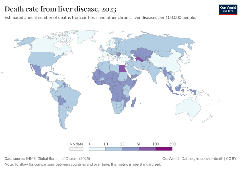IHME, Global Burden of Disease (2025) – with major processing by Our World in Data. “Death rate from liver disease” [dataset]. IHME, Global Burden of Disease, “Global Burden of Disease - Deaths” [original data]. Retrieved February 25, 2026 from https://style-housekeeper-simplifyre.owid.pages.dev:8789/20260211-174736/grapher/death-rate-from-liver-disease.html (archived on February 11, 2026).