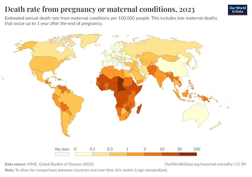 IHME, Global Burden of Disease (2025) – with major processing by Our World in Data. “Death rate from pregnancy or maternal conditions” [dataset]. IHME, Global Burden of Disease, “Global Burden of Disease - Deaths” [original data]. Retrieved February 25, 2026 from https://style-housekeeper-simplifyre.owid.pages.dev:8789/20260211-174736/grapher/death-rate-from-maternal-disorders-ihme.html (archived on February 11, 2026).