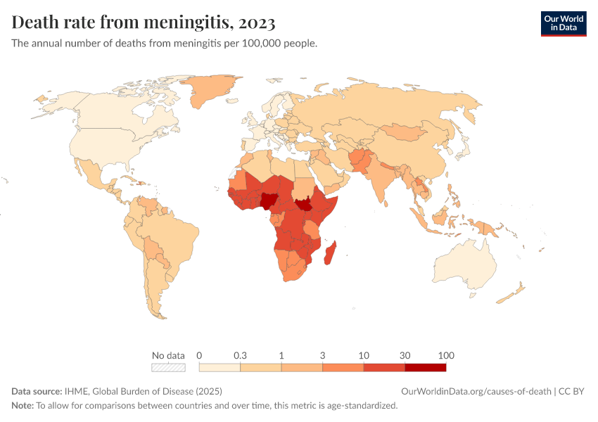 “Data Page: Death rate from meningitis”, part of the following publication: Esteban Ortiz-Ospina and Max Roser (2016) - “Global Health”. Data adapted from IHME, Global Burden of Disease. Retrieved from https://style-housekeeper-simplifyre.owid.pages.dev:8789/20260211-174736/grapher/death-rate-from-meningitis.html [online resource] (archived on February 11, 2026).How to cite this data