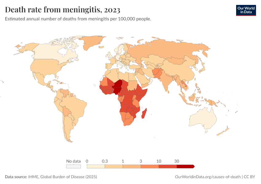 “Data Page: Death rate from meningitis”, part of the following publication: Esteban Ortiz-Ospina and Max Roser (2016) - “Global Health”. Data adapted from IHME, Global Burden of Disease. Retrieved from https://style-housekeeper-simplifyre.owid.pages.dev:8789/20260211-174736/grapher/death-rate-from-meningitis-gbd.html [online resource] (archived on February 11, 2026).How to cite this data