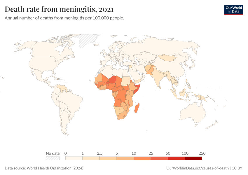 World Health Organization (2024) – with major processing by Our World in Data. “Death rate from meningitis” [dataset]. World Health Organization, “Global Health Estimates” [original data]. Retrieved February 25, 2026 from https://style-housekeeper-simplifyre.owid.pages.dev:8789/20250909-093708/grapher/death-rate-from-meningitis-who.html (archived on September 9, 2025).