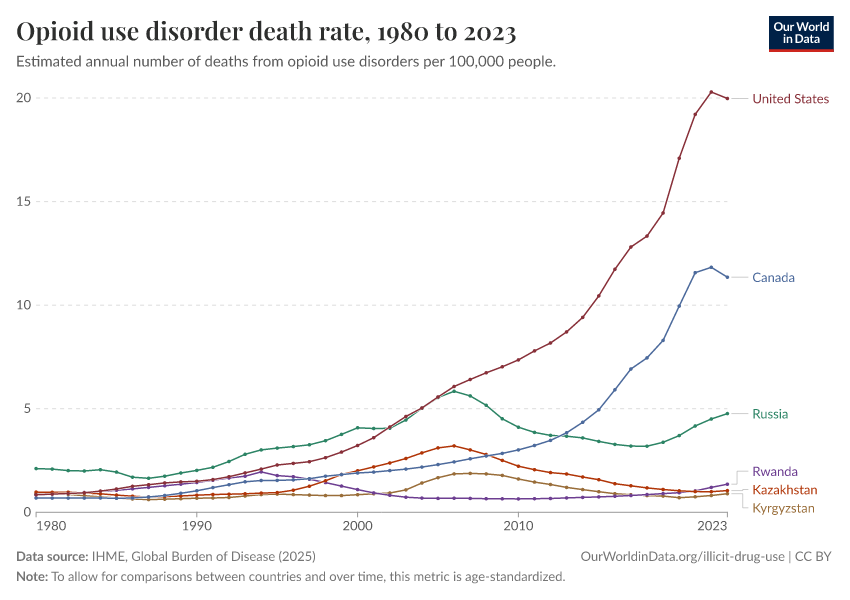 IHME, Global Burden of Disease (2025) – with major processing by Our World in Data. “Opioid use disorder death rate” [dataset]. IHME, Global Burden of Disease, “Global Burden of Disease - Deaths” [original data]. Retrieved February 25, 2026 from https://style-housekeeper-simplifyre.owid.pages.dev:8789/20260211-174736/grapher/death-rate-from-opioid-use.html (archived on February 11, 2026).