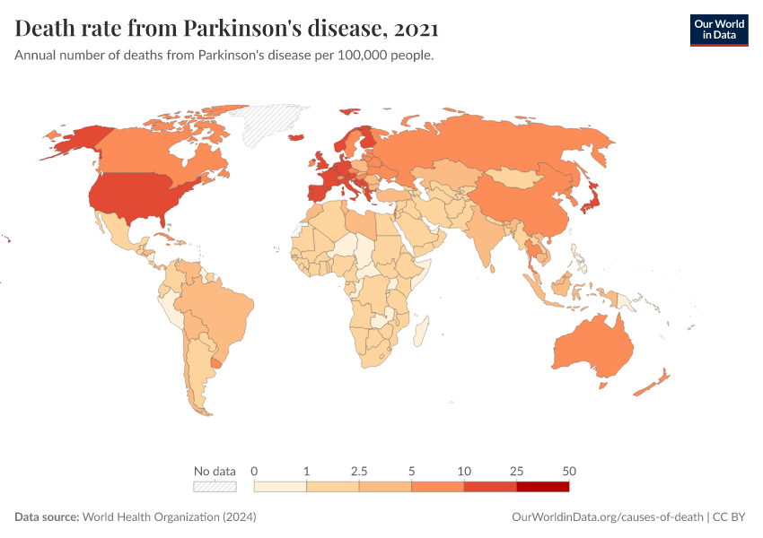 World Health Organization (2024) – with major processing by Our World in Data. “Death rate from Parkinson's disease” [dataset]. World Health Organization, “Global Health Estimates” [original data]. Retrieved February 25, 2026 from https://style-housekeeper-simplifyre.owid.pages.dev:8789/20250909-093708/grapher/death-rate-from-parkinsons-disease-ghe.html (archived on September 9, 2025).