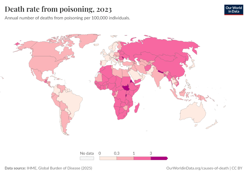 “Data Page: Death rate from poisoning”, part of the following publication: Esteban Ortiz-Ospina and Max Roser (2016) - “Global Health”. Data adapted from IHME, Global Burden of Disease. Retrieved from https://style-housekeeper-simplifyre.owid.pages.dev:8789/20260211-174736/grapher/death-rate-from-poisoning-gbd.html [online resource] (archived on February 11, 2026).How to cite this data