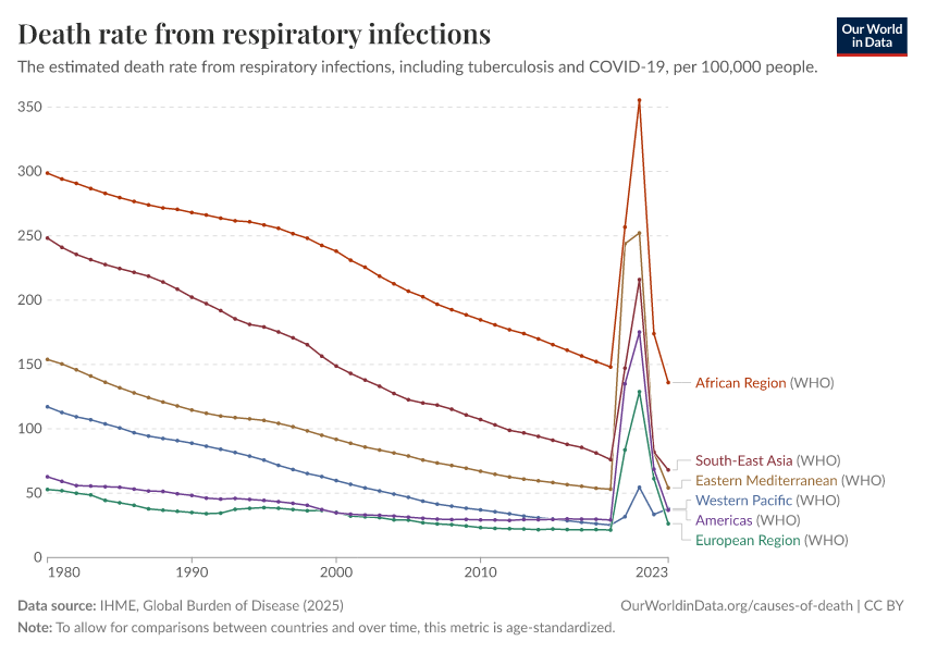 IHME, Global Burden of Disease (2025) – with major processing by Our World in Data. “Death rate from respiratory infections” [dataset]. IHME, Global Burden of Disease, “Global Burden of Disease - Deaths” [original data]. Retrieved February 25, 2026 from https://style-housekeeper-simplifyre.owid.pages.dev:8789/20260211-174736/grapher/death-rate-from-respiratory-infections.html (archived on February 11, 2026).