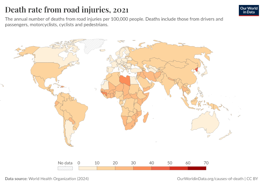 World Health Organization (2024) – with major processing by Our World in Data. “Death rate from road injuries” [dataset]. World Health Organization, “Global Health Estimates” [original data]. Retrieved February 25, 2026 from https://style-housekeeper-simplifyre.owid.pages.dev:8789/20250909-093708/grapher/death-rate-from-road-accidents-ghe.html (archived on September 9, 2025).