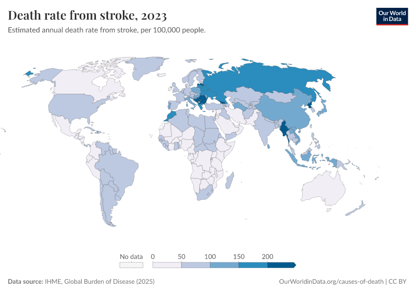 IHME, Global Burden of Disease (2025) – with major processing by Our World in Data. “Death rate from stroke” [dataset]. IHME, Global Burden of Disease, “Global Burden of Disease - Deaths” [original data]. Retrieved February 25, 2026 from https://style-housekeeper-simplifyre.owid.pages.dev:8789/20260211-174736/grapher/death-rate-from-strokes.html (archived on February 11, 2026).