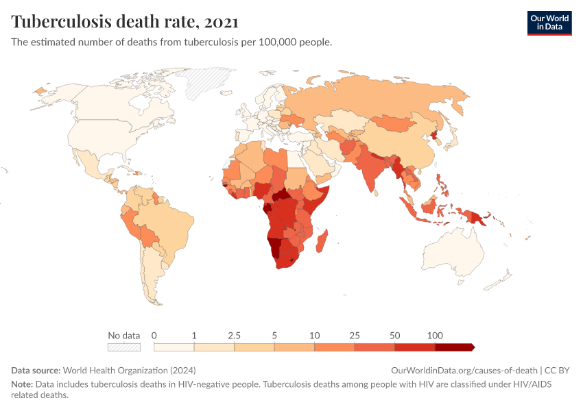 World Health Organization (2024) – with major processing by Our World in Data. “Tuberculosis death rate” [dataset]. World Health Organization, “Global Health Estimates” [original data]. Retrieved February 25, 2026 from https://style-housekeeper-simplifyre.owid.pages.dev:8789/20250909-093708/grapher/death-rate-from-tuberculosis-ghe.html (archived on September 9, 2025).