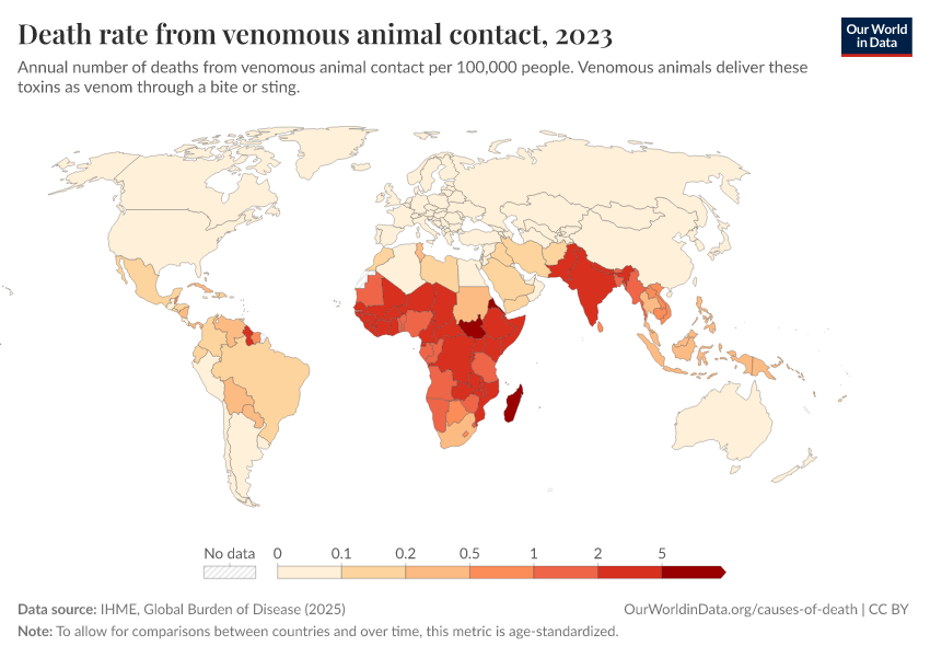IHME, Global Burden of Disease (2025) – with major processing by Our World in Data. “Death rate from venomous animal contact” [dataset]. IHME, Global Burden of Disease, “Global Burden of Disease - Deaths” [original data]. Retrieved February 25, 2026 from https://style-housekeeper-simplifyre.owid.pages.dev:8789/20260211-174736/grapher/death-rate-from-venomous-animal.html (archived on February 11, 2026).