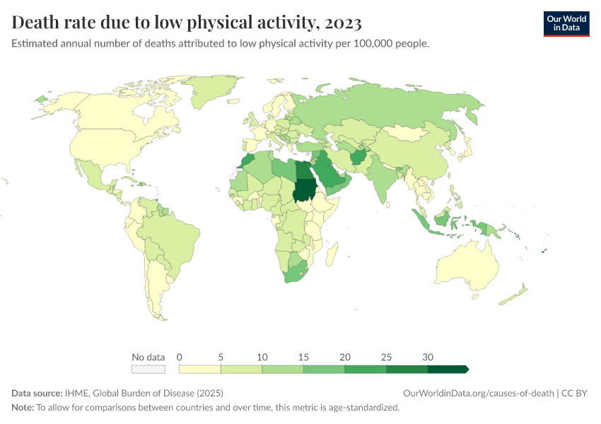 IHME, Global Burden of Disease (2025) – with major processing by Our World in Data. “Death rate due to low physical activity” [dataset]. IHME, Global Burden of Disease, “Global Burden of Disease - Risk Factors - Deaths” [original data]. Retrieved February 25, 2026 from https://style-housekeeper-simplifyre.owid.pages.dev:8789/20260213-112438/grapher/death-rates-due-to-low-physical-activity.html (archived on February 13, 2026).