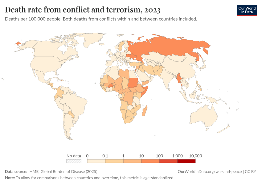 “Data Page: Death rate from conflict and terrorism”, part of the following publication: Esteban Ortiz-Ospina and Max Roser (2016) - “Global Health”. Data adapted from IHME, Global Burden of Disease. Retrieved from https://style-housekeeper-simplifyre.owid.pages.dev:8789/20260211-174736/grapher/death-rates-from-conflict-and-terrorism-gbd.html [online resource] (archived on February 11, 2026).How to cite this data