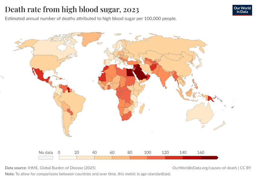IHME, Global Burden of Disease (2025) – with major processing by Our World in Data. “Death rate from high blood sugar” [dataset]. IHME, Global Burden of Disease, “Global Burden of Disease - Risk Factors - Deaths” [original data]. Retrieved February 25, 2026 from https://style-housekeeper-simplifyre.owid.pages.dev:8789/20260213-112438/grapher/death-rates-from-high-blood-sugar.html (archived on February 13, 2026).