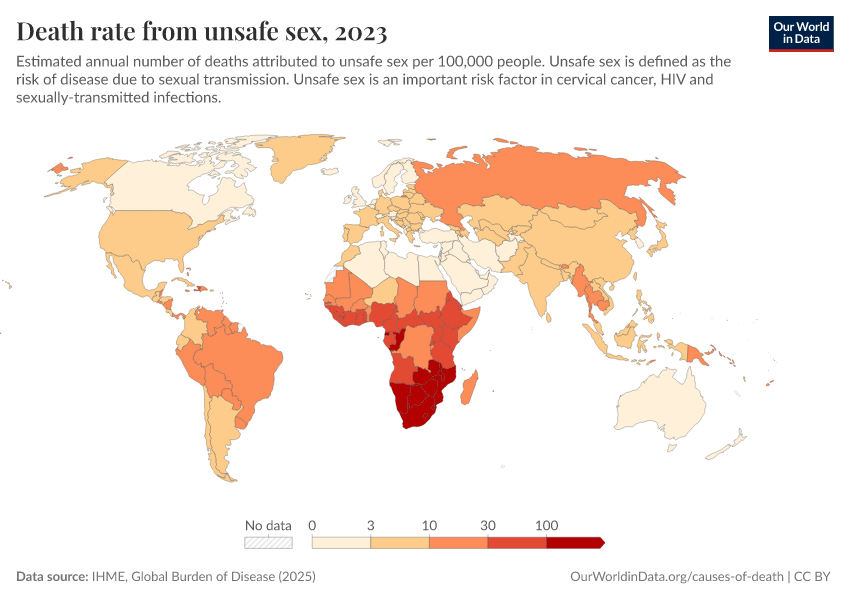 IHME, Global Burden of Disease (2025) – with major processing by Our World in Data. “Death rate from unsafe sex” [dataset]. IHME, Global Burden of Disease, “Global Burden of Disease - Risk Factors - Deaths” [original data]. Retrieved February 25, 2026 from https://style-housekeeper-simplifyre.owid.pages.dev:8789/20260213-113303/grapher/death-rates-from-unsafe-sex-gbd.html (archived on February 13, 2026).
