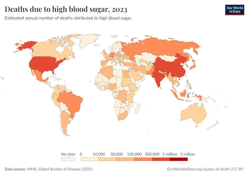 IHME, Global Burden of Disease (2025) – with major processing by Our World in Data. “Deaths due to high blood sugar” [dataset]. IHME, Global Burden of Disease, “Global Burden of Disease - Risk Factors - Deaths” [original data]. Retrieved February 25, 2026 from https://style-housekeeper-simplifyre.owid.pages.dev:8789/20260213-112438/grapher/deaths-due-to-high-blood-sugar.html (archived on February 13, 2026).