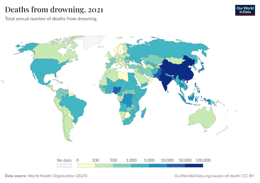 World Health Organization (2024) – with major processing by Our World in Data. “Deaths from drowning” [dataset]. World Health Organization, “Global Health Estimates” [original data]. Retrieved February 25, 2026 from https://style-housekeeper-simplifyre.owid.pages.dev:8789/20250909-093708/grapher/deaths-from-drowning-ghe.html (archived on September 9, 2025).