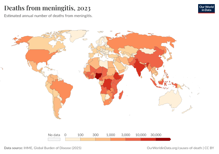 “Data Page: Deaths from meningitis”, part of the following publication: Esteban Ortiz-Ospina and Max Roser (2016) - “Global Health”. Data adapted from IHME, Global Burden of Disease. Retrieved from https://style-housekeeper-simplifyre.owid.pages.dev:8789/20260211-174736/grapher/deaths-from-meningitis.html [online resource] (archived on February 11, 2026).How to cite this data